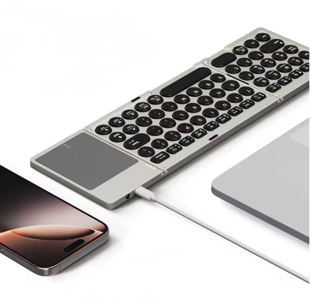 Die magic Tastatur faltet sich auf handliche Größe zusammen, ist superleicht und kommt mit einer abnehmbaren Schutzhülle. So passt sie in jede Tasche und ist jederzeit einsatzbereit.